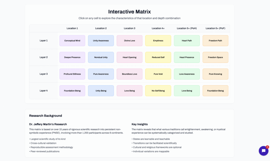 Fundamental Wellbeing can look different depending on the type or location you’re experiencing. A shift into “Type 1” looks and feels very different from a shift into “Type 4.” Our assessment pinpoints your exact position on the Martin Matrix, giving you the context you need to explore the unique qualities of your experience.